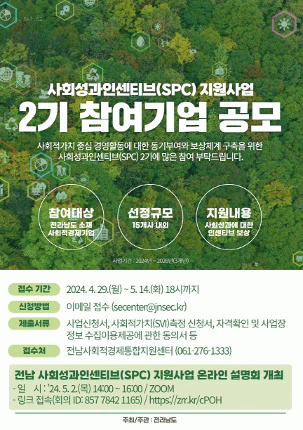 [¹Ìµð¾îÀü³² Á¦°¥´ëÁ¾ ±âÀÚ]Àü¶ó³²µµ°¡ ¿À´Â 14ÀϱîÁö »çȸÀû°æÁ¦±â¾÷ÀÌ Ã¢ÃâÇÑ »çȸ¼º°ú¸¦ Àμ¾Æ¼ºê·Î º¸»óÇØ ±â¾÷ ÁÖµµÀÇ »çȸÀû°æÁ¦ »ýŰè Á¶¼ºÀ» Áö¿øÇϱâ À§ÇØ ¡®Àü³² »çȸ¼º°úÀμ¾Æ¼ºê(SPC) Áö¿ø»ç¾÷(2±â)¡¯ Âü¿© ±â¾÷À» ¸ðÁýÇÑ´Ù¡¦
