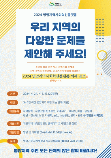 [¹Ìµð¾îÀü³² °í±Ô¼® ±âÀÚ]¿µ¾Ï±ºÀÌ ÀÌ´Þ 13ÀϱîÁö ¡®2024³â ¿µ¾ÏÁö¿ª »çȸÇõ½Å Ç÷§Æû ½ÇÇà ÀÇÁ¦¡¯¸¦ °ø¸ðÇÑ´Ù. »çȸÇõ½Å Ç÷§ÆûÀº Áö¿ªÁֹΰú ¹Î°£´Üü, °ø°ø±â°ü µîÀÌ Çù¾÷À¸·Î Áö¿ª ¹®Á¦¸¦ ÇØ°áÇÏ´Â °ø°£. ¿µ¾ÏÁö¿ª »çȸÇõ½Å Ç÷§¡¦