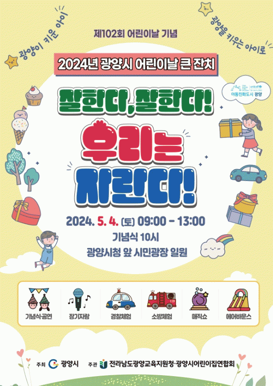 [¹Ìµð¾îÀü³² ÀÓ¼º¿Ï ±âÀÚ]±¤¾ç½Ã´Â Á¦102ȸ ¾î¸°À̳¯À» ¸ÂÀÌÇØ ¿À´Â 5¿ù 4ÀÏ ¿ÀÀü 9½ÃºÎÅÍ ¿ÀÈÄ 1½Ã±îÁö ±¤¾ç½Ãû ¾Õ ½Ã¹Î±¤Àå ÀÏ¿ø¿¡¼ ¡®2024³â ±¤¾ç½Ã ¾î¸°À̳¯ Å«ÀÜÄ¡ Çà»ç¡¯°¡ °³ÃÖµÈ´Ù°í ¹àÇû´Ù. À̹ø Çà»ç´Â Àü¶ó³²µµ±¤¾ç±³À°Áö¿ø¡¦