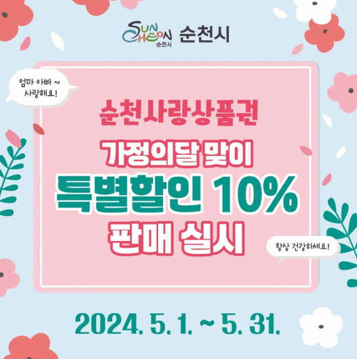 [¹Ìµð¾îÀü³² ÀÓ¼º¿Ï ±âÀÚ]¼øÃµ½Ã°¡ 5¿ù 1ÀϺÎÅÍ 5¿ù ¸»±îÁö 1°³¿ù°£ °¡Á¤ÀÇ ´ÞÀ» ¸Â¾Æ ¼øÃµ»ç¶û»óǰ±Ç Ưº°ÇÒÀÎ(10%) ÆÇ¸Å¸¦ ½Ç½ÃÇÑ´Ù°í ¹àÇû´Ù. ½Ã´Â ½Ã¹ÎµéÀÇ °¡°èºÎ´ãÀ» ¿ÏÈÇϰí Áö¿ª°æÁ¦¿¡ Ȱ·ÂÀ» ºÒ¾î³Ö°íÀÚ 3¿ùºÎÅÍ 4¿ù±îÁö ÁøÇࡦ
