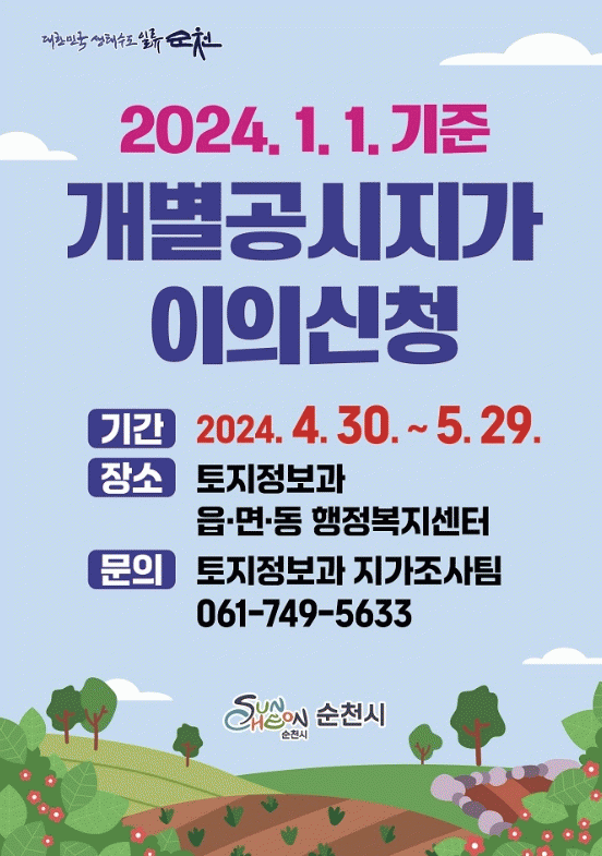 [¹Ìµð¾îÀü³² ÀÓ¼º¿Ï ±âÀÚ]¼øÃµ½Ã´Â 2024³â 1¿ù 1ÀÏ ±âÁØ °³º°°ø½ÃÁö°¡ ´ë»ó ÅäÁöÀÎ 29¸¸ 9,178ÇÊÁö¿¡ ´ëÇØ 4¿ù 30ÀÏ ÀÚ·Î °áÁ¤ °ø½ÃÇϰí, 5¿ù 29ÀϱîÁö ÀÌÀǽÅûÀ» ¹Þ´Â´Ù°í ¹àÇû´Ù. ½Ã´Â °³º°ÅäÁö¿¡ ´ëÇÑ Æ¯¼º Á¶»ç¿Í ºñ±³ Ç¥ÁØÁö¸¦ ¼±¡¦