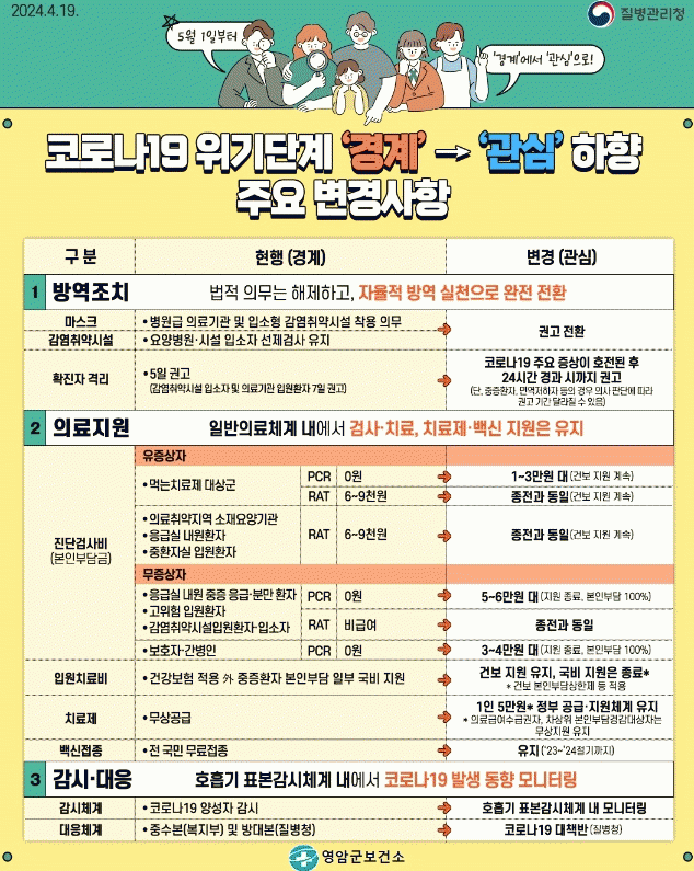 [¹Ìµð¾îÀü³² °í±Ô¼® ±âÀÚ]¿µ¾Ï±ºÀÌ Á¤ºÎ ¹æÄ§¿¡ µû¶ó 5/1ÀϺÎÅÍ Äڷγª19 À§±â´Ü°è¸¦ ÇöÇà ¡®°æ°è¡¯¿¡¼ °¡Àå ³·Àº ´Ü°èÀÎ ¡®°ü½É¡¯À¸·Î ÇÏÇâÇϰí, ¹æ¿ªÁ¶Ä¡, ÀÇ·áÁö¿ø °¨½Ã¡¤´ëÀÀü°è¸¦ Á¶Á¤ÇÑ´Ù. ¹æ¿ªÁ¶Ä¡´Â º´¿ø±Þ ÀÇ·á±â°ü°ú ÀÔ¼ÒÇü¡¦