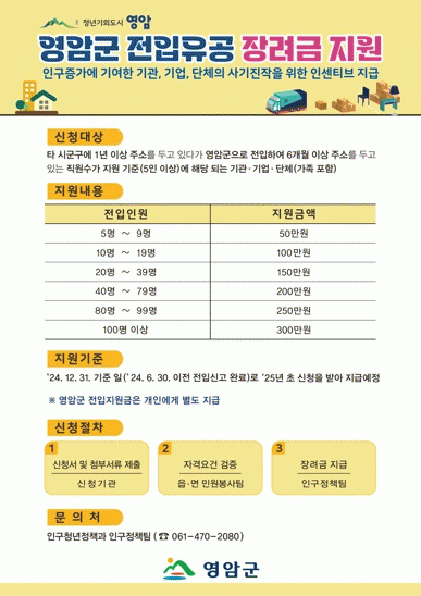 [¹Ìµð¾îÀü³² °í±Ô¼® ±âÀÚ]¿µ¾Ï±ºÀÌ ¿ÃÇØ ¿¬¸»±îÁö Áý°èÇØ, Àα¸ ÀüÀÔ¿¡ °øÀÌ ÀÖ´Â ±â°ü¡¤±â¾÷¡¤´Üü¿¡ Àå·Á±ÝÀ» Áö¿øÇÑ´Ù. À̹ø ¡®Àα¸ ÀüÀÔ À¯°ø Àå·Á±Ý Áö¿ø»ç¾÷¡¯Àº ¿µ¾Ï±ºÀÇ Àα¸°¨¼Ò ´ëÀÀÃ¥ÀÇ Çϳª. 2024³â 12¿ù 31ÀÏ ±âÁØ, ¿µ¾Ï¡¦