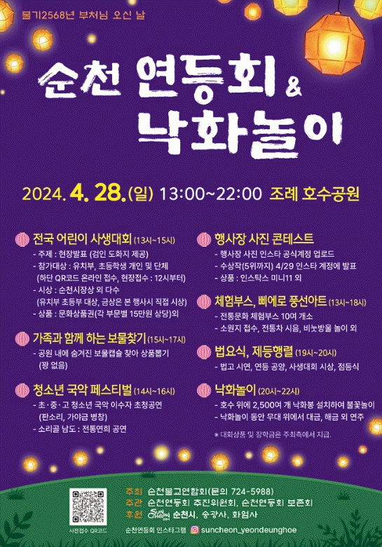 [¹Ìµð¾îÀü³² ÀÓ¼º¿Ï ±âÀÚ]ºÒ±â 2568³â ¡®ºÎó´Ô ¿À½Å ³¯¡¯À» ±â³äÇÏ´Â ¼øÃµ ¿¬µîȸ°¡ ¿À´Â 28ÀÏ ¿ÀÈÄ 1½ÃºÎÅÍ 9½Ã±îÁö ¼øÃµ Á¶·ÊÈ£¼ö°ø¿ø ÀÏ¿ø¿¡¼ °³ÃֵȴÙ. ¼øÃµºÒ±³»ç¾Ï¿¬ÇÕȸ°¡ ÁÖÃÖÇÏ´Â ¼øÃµ ¿¬µîȸ´Â ¿ÀÈÄ 1½ÃºÎÅÍ ´Ù¾çÇÑ ºÎ´ëÇࡦ