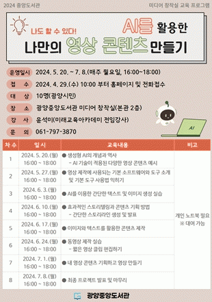 [¹Ìµð¾îÀü³² ÀÓ¼º¿Ï ±âÀÚ]±¤¾çÁß¾Óµµ¼°üÀº ½Ã¹ÎµéÀÇ ¹Ìµð¾î ÄÜÅÙÃ÷ âÀÛ ´É·ÂÀ» Ű¿ì°í ±Þº¯ÇÏ´Â µðÁöÅРȯ°æ¿¡ ºü¸£°Ô ÀûÀÀÇÒ ¼ö ÀÖµµ·Ï ¡®AI¸¦ Ȱ¿ëÇÑ ¿µ»ó Á¦ÀÛ ±³À°¡¯À» ¿î¿µÇÑ´Ù°í 24ÀÏ ¹àÇû´Ù. À̹ø ±³À°Àº ¿À´Â 5¿ù 20ÀϺÎÅÍ 7¿ù¡¦