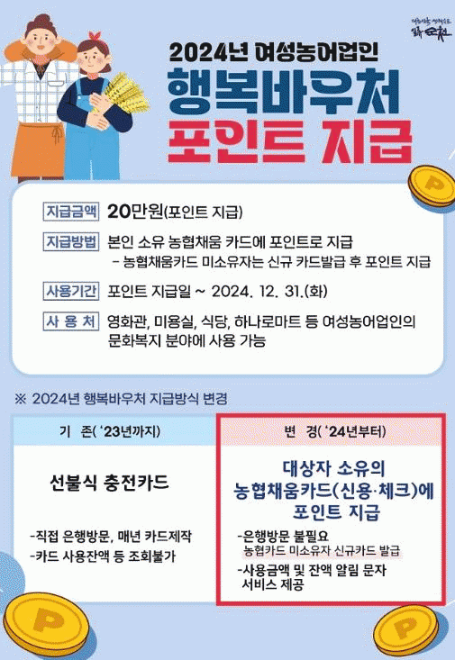 [¹Ìµð¾îÀü³² ÀÓ¼º¿Ï ±âÀÚ]¼øÃµ½Ã´Â ¿©¼º³ó¾î¾÷ÀÎ Çູ¹Ù¿ìó Áö¿ø ´ë»óÀÚ 6,713¸íÀ» ¼±Á¤Çϰí, ¹®È ¡¤ º¹Áö¿¡ »ç¿ë °¡´ÉÇÑ Çູ¹Ù¿ìó 20¸¸¿øÀ» Áö¿øÇÑ´Ù. ½Ã´Â ¸Å³â ¼±ºÒÇü ±âÇÁÆ® Ä«µå¸¦ Áö±ÞÇß´ø ¹æ½Ä¿¡¼ ¿ÃÇØºÎÅÍ´Â º»ÀÎ ¸íÀÇ ³óÇù¡¦