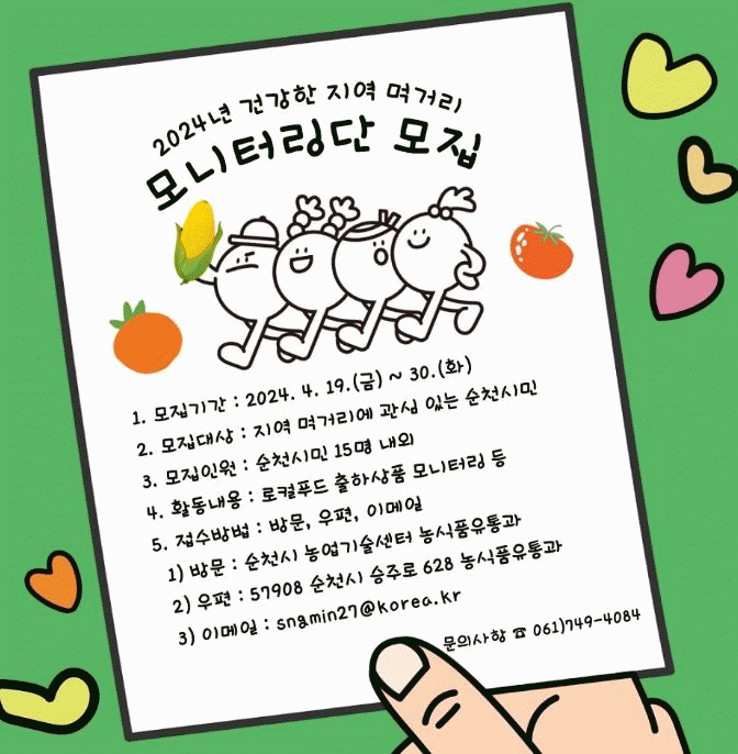 [¹Ìµð¾îÀü³² ÀÓ¼º¿Ï ±âÀÚ]¼øÃµ½Ã´Â ¿ì¸® Áö¿ª ¸Ô°Å¸®¿¡ ´ëÇÑ °ü½É Á¦°í¿Í ·ÎÄÃǪµå Á÷¸ÅÀå ÃâÇÏ ³ó»ê¹° ¾ÈÀü¼º È®º¸¸¦ À§ÇØ '2024³â °Ç°ÇÑ Áö¿ª ¸Ô°Å¸® ¸ð´ÏÅ͸µ´Ü'À» ¿À´Â 30ÀϱîÁö ¸ðÁýÇÑ´Ù°í ¹àÇû´Ù. ¿ÃÇØ ÁøÇàµÇ´Â ¸ð´ÏÅ͸µ´ÜÀº 15¡¦