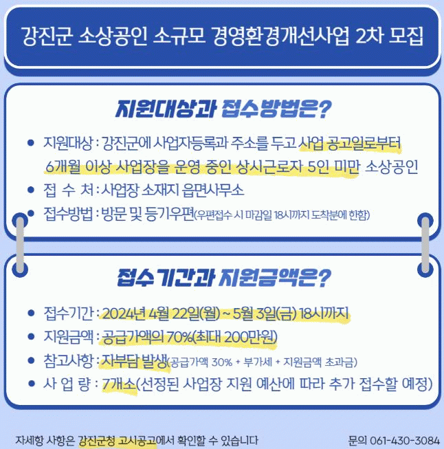 [¹Ìµð¾îÀü³² °í±Ô¼® ±âÀÚ]°Áø±ºÀÌ 1Â÷ ¸ðÁý¿¡ 54°³¼Ò »ç¾÷ÀåÀ» ¼±Á¤ÇØ ¾à 8,615¸¸¿øÀ» Áö¿øÇÑ µ¥ À̾î 4¿ù 22ÀϺÎÅÍ 5¿ù 3ÀϱîÁö ¼Ò»ó°øÀÎ ¼Ò±Ô¸ð °æ¿µÈ¯°æ °³¼± »ç¾÷´ë»óÀÚ 7°³¼Ò¸¦ Ãß°¡ ¸ðÁýÇÑ´Ù. ¼Ò»ó°øÀÎ ¼Ò±Ô¸ð °æ¿µÈ¯°æ °³¼± »ç¡¦