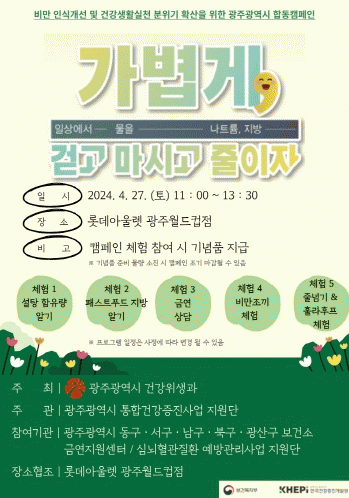 [¹Ìµð¾îÀü³² Á¦°¥´ëÁ¾ ±âÀÚ]±¤ÁÖ±¤¿ª½Ã´Â ºñ¸¸¿¹¹æ°ü¸®¸¦ À§ÇÑ ¡®ÇÏ·ç ¸¸º¸°È±â¡¯ 縰Áö¿Í ¹Î¡¤°ü ÇÕµ¿ ºñ¸¸¿¹¹æ°ü¸® Çà»ç¸¦ ÀÕµû¶ó ¿¬´Ù. ¡®°¡º±°Ô Àϻ󿡼 °È°í, ¹°À» ¸¶½Ã°í, ³ªÆ®·ý¡¤Áö¹æÀ» ÁÙÀÌÀÚ¡¯¸¦ ±¸È£·Î ³»°Ç ÀÌ Çà»ç´Â ¹Ù»Û¡¦