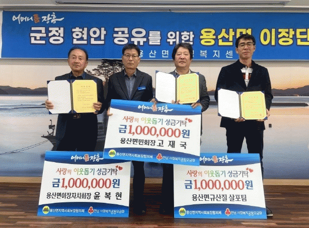 [¹Ìµð¾îÀü³² Á¦°¥´ëÁ¾ ±âÀÚ]ÀåÈﱺ ¿ë»ê¸éÀº Áö¿ªÀÇ ¾î·Á¿î ÀÌ¿ôÀ» À§ÇØ ¼º±Ý ±âʰú ±âºÎ ¹°Ç°ÀÌ °è¼Ó À̾îÁö°í ÀÖ´Ù°í ¹àÇû´Ù. Áö³ 18ÀÏ ¿ë»ê¸é °íÀç±¹ ¸é¹ÎÀÇ Àå, ¿ë»ê¸é ±Ô»êÁú »ìÆ÷ÆÀ, ¿ë»ê¸é À±º¹Çö ÀÌÀåÀÚġȸÀå, µ¿¾ç³ó±â°è ÀÌ¡¦