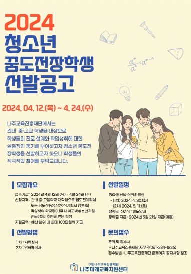 [¹Ìµð¾îÀü³² Á¦°¥´ëÁ¾ ±âÀÚ](Àç)³ªÁÖ±³À°ÁøÈïÀç´ÜÀº ³ªÁֽà Áß¡¤°íµîÇб³ Çлý ¹× û¼Ò³âµéÀ» ´ë»óÀ¸·Î¡®Ã»¼Ò³â ²ÞµµÀü ÀåÇбݡ¯À» Áö¿øÇÑ´Ù°í 18ÀÏ ¹àÇû´Ù. ¡®Ã»¼Ò³â ²ÞµµÀü ÀåÇбݡ¯Àº Áø·Î¿¡ ´ëÇÑ °èȹÀ» Á÷Á¢ ¼ö¸³ÇÑ °³ÀÎ ¶Ç´Â ÆÀ¿¡¡¦