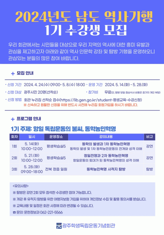 [¹Ìµð¾îÀü³² Á¦°¥´ëÁ¾ ±âÀÚ] ±¤ÁÖÇлýµ¶¸³¿îµ¿±â³äȸ°üÀÌ ¿À´Â 24ÀϺÎÅÍ ³»´Þ 8ÀϱîÁö ½Ã¹ÎµéÀ» ´ë»óÀ¸·Î ¡®³²µµ ¿ª»ç±âÇ࡯ 1±â ¼ö°»ýÀ» ¸ðÁýÇÑ´Ù. ¡®³²µµ ¿ª»ç±âÇ࡯Àº ¿ì¸® Áö¿ªÀ» ¹è°æÀ¸·Î ÇÑ ¿ª»çÀû »ç°Ç°ú Àǹ̸¦ ÅëÇØ °ú°Å¿Í ¡¦