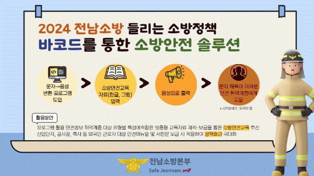 [¹Ìµð¾îÀü³² ÀüÇü¼º ±âÀÚ] ¿©¼ö¼Ò¹æ¼´Â 2024³â º½Ã¶ ¼Ò¹æ¾ÈÀü´ëÃ¥ÀÇ ÀÏȯÀ¸·Î ½Ã°¢Àå¾ÖÀÎ µî Á¤º¸ Ãë¾à°èÃþÀ» À§ÇÏ¿© ¹ÙÄڵ带 Ȱ¿ëÇÑ ¼Ò¹æ¾ÈÀüÇÁ·Î±×·¥À» Á¦°øÇÑ´Ù°í ¹àÇû´Ù. ¼ÒÇÁÆ®¿þ¾î Ȱ¿ëÀ» ÅëÇØ ¹®ÀÚ ÇØµ¶ÀÌ ¾î·Á¿î ½Ã°¢Àå¾ÖÀΰú¡¦