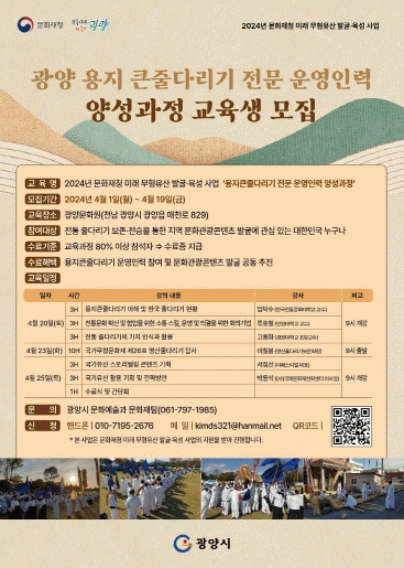 [¹Ìµð¾îÀü³² ÀÓ¼º¿Ï ±âÀÚ]±¤¾ç½Ã´Â ¿ëÁöÅ«Áٴٸ®±âÀÇ Àü½ÂÀ» À§ÇØ ¡®¿ëÁöÅ«Áٴٸ®±â Àü¹® ¿î¿µÀη ¾ç¼º°úÁ¤¡¯ ±³À°»ýÀ» ¿À´Â 19ÀϱîÁö ¸ðÁýÇÑ´Ù°í ¹àÇû´Ù. º» °úÁ¤Àº 2024³â ¹®ÈÀçû °ø¸ð»ç¾÷ÀÎ ¹Ì·¡ ¹«ÇüÀ¯»ê ¹ß±¼¡¤À°¼º ¡®±è dzÀÛ ¼Ò¡¦