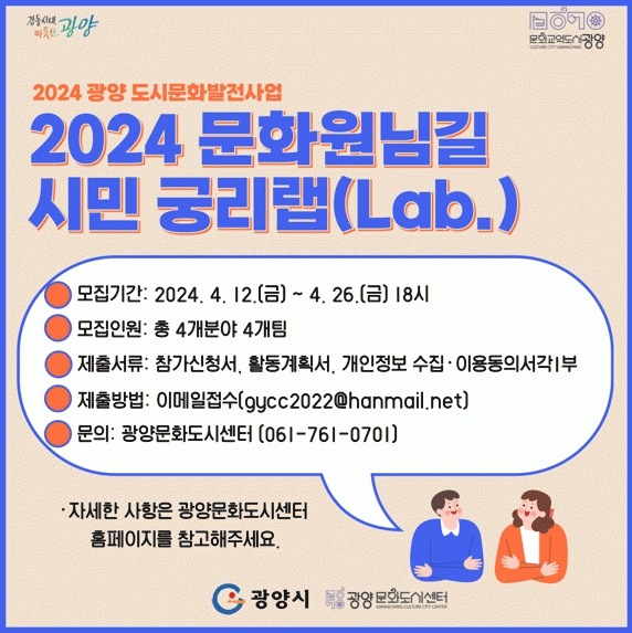 [¹Ìµð¾îÀü³² ÀÓ¼º¿Ï ±âÀÚ]±¤¾ç¹®Èµµ½Ã¼¾ÅͰ¡ 2024³â ¹®È¿ø´Ô±æ »ç¾÷À» À§ÇØ ¡®½Ã¹Î ±Ã¸®·¦(Lab.)¡¯ Âü¿©ÀÚ¸¦ ¸ðÁýÇÑ´Ù°í 15ÀÏ ¹àÇû´Ù. ½Ã¹Î ±Ã¸®·¦Àº ¡®½Ã¹ÎµéÀÌ ´Ù¾çÇÑ ±Ã¸®¸¦ ÇÏ´Â ·¦(Laboratory, ¿¬±¸½Ç)¡¯À» ¸»Çϸç, ½Ã¹Î ±Ã¸®·¦ ¡¦