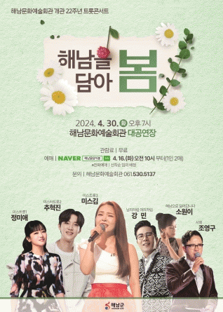 [¹Ìµð¾îÀü³² Á¦°¥´ëÁ¾ ±âÀÚ]ÇØ³²±ºÀº ÇØ³²¹®È¿¹¼úȸ°ü °³°ü 22ÁÖ³âÀ» ±â³äÇØ Æ®·ÔÄܼƮ¡®Çس²À» ´ã¾Æ º½¡¯À» 4¿ù 30ÀÏ ¿ÀÈÄ7½Ã ¹®È¿¹¼úȸ°ü ´ë°ø¿¬Àå¿¡¼ °³ÃÖÇÑ´Ù. ¡®Çس²À» ´ã¾Æ º½¡¯Àº ¹Ì½ºÆ®·Ô3 °æ¿¬ ÇÁ·Î±×·¥¿¡¼ 4À§¿¡ ÀÔ»óÇÑ ¡¦