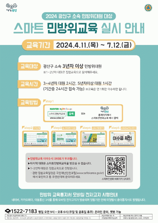 [¹Ìµð¾îÀü³² ±èÁ¤¿ì ±âÀÚ]±¤ÁÖ±¤¿ª½Ã ±¤»ê±¸´Â ¹Î¹æÀ§ ´ë¿øµéÀ» ´ë»óÀ¸·Î ¿¬Â÷º°·Î ÁýÇÕ±³À°°ú »çÀ̹ö±³À°À» µ¿½Ã¿¡ ½Ç½ÃÇÑ´Ù°í ¹àÇû´Ù. ¹Î¹æÀ§ ±³À°Àº 1~2³â Â÷ ´ë¿ø ´ë»ó 4½Ã°£ÀÇ ÁýÇÕ±³À°ÀÌ Áö³ÇØ 3³â ¸¸¿¡ Àç°³µÆ´Ù. ¶Ç 3~4³â Â÷ ´ë¡¦