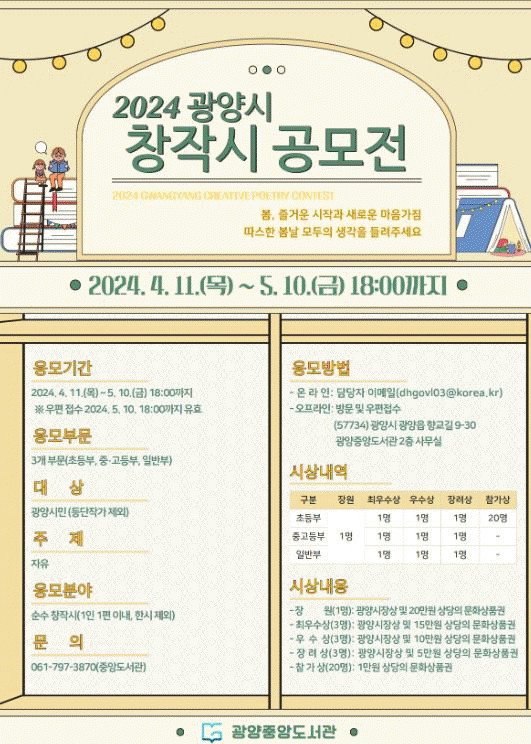 [¹Ìµð¾îÀü³² ÀÓ¼º¿Ï ±âÀÚ]±¤¾ç½Ã°¡ ±¤¾çÁß¾Óµµ¼°ü ÁÖ°üÀ¸·Î ¡®2024 âÀ۽à °ø¸ðÀü¡¯À» °³ÃÖÇÑ´Ù°í 9ÀÏ ¹àÇû´Ù. À̹ø °ø¸ðÀüÀº 2024³â ±¤¾çµ¶¼´ëÀü ¹× Á¦60ȸ µµ¼°üÁÖ°£À» ¸Â¾Æ 4¿ù 11ÀϺÎÅÍ 5¿ù 10ÀϱîÁö ¿¸®¸ç ¡ãÃʵîºÎ ¡ãÁß¡¤°í¡¦