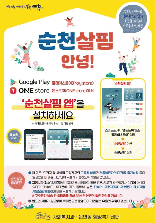 [¹Ìµð¾îÀü³² ÀÓ¼º¿Ï ±âÀÚ]¼øÃµ½Ã´Â 1ÀÎ °¡±¸ ¹× Ãë¾à°èÃþÀÇ À§±â»óȲ ¿¹¹æÀ» À§ÇØ¡®¼øÃµ »ìÇË ¾Û¡¯À» µµÀÔÇϰí Áö³ 5ÀϺÎÅÍ º»°Ý ¿î¿µ¿¡ ³ª¼¹´Ù°í ¹àÇû´Ù. ¡®¼øÃµ »ìÇË ¾Û¡¯Àº ÁöÁ¤ÇÑ ½Ã°£(ÃÖ¼Ò 12½Ã°£) ÀÌ»ó ÈÞ´ëÀüÈ »ç¿ëÀÌ ¾øÀ» ¶§ ¡¦