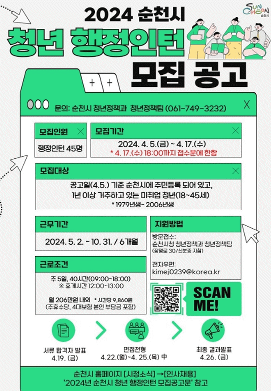 [¹Ìµð¾îÀü³² ÀÓ¼º¿Ï ±âÀÚ]¼øÃµ½Ã´Â ¿À´Â 17ÀϱîÁö 2024³â ¼øÃµ½Ã û³â ÇàÁ¤ÀÎÅÏ Âü°¡ÀÚ¸¦ ¸ðÁýÇÑ´Ù°í ¹àÇû´Ù. ¼±¹ßÀοøÀº ÃÑ 45¸íÀ¸·Î, 5¿ùºÎÅÍ 10¿ù±îÁö 6°³¿ù µ¿¾È ¼øÃµ½Ã ½Çž°úž¼Ò, À¾¸éµ¿ ÇàÁ¤º¹Áö¼¾ÅÍ¿¡¼ ±Ù¹«Çϸç ÇàÁ¤ ½Ç¹« °æÇ衦