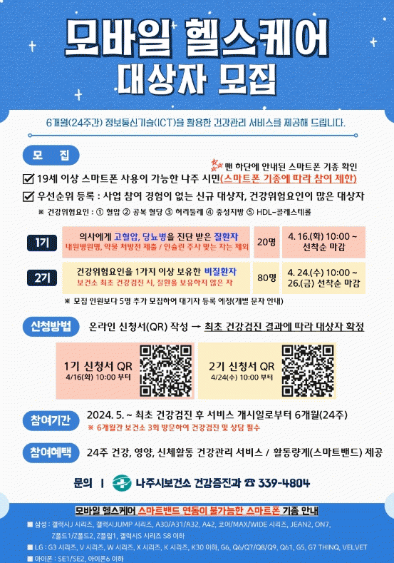 [¹Ìµð¾îÀü³² Á¦°¥´ëÁ¾ ±âÀÚ]³ªÁֽà º¸°Ç¼Ò°¡ Á¤º¸Åë½Å±â¼ú(ICT)¸¦ Ȱ¿ëÇÑ °Ç°°ü¸®¼ºñ½º ¡®¸ð¹ÙÀÏ ÇコÄɾ »ç¾÷ Âü°¡ÀÚ¸¦ ¼±Âø¼øÀ¸·Î 100¸íÀ» ¸ðÁýÇÑ´Ù. ¡®¸ð¹ÙÀÏ ÇコÄɾ´Â ¸ð¹ÙÀÏ ¾Û¿¡ Ȱµ¿·®°è(½º¸¶Æ®¹êµå)¸¦ ¿¬µ¿ÇÏ¿© °³Àκ°¡¦