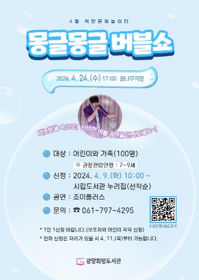 [¹Ìµð¾îÀü³² ÀÓ¼º¿Ï ±âÀÚ]±¤¾çÈñ¸Áµµ¼°üÀÌ ¹®È°¡ ÀÖ´Â ³¯À» ¸Â¾Æ ¿À´Â 24ÀÏ ¿ÀÈÄ 5½Ã ²Þ³ª¹«±ØÀå¿¡¼ ¾î¸°ÀÌ 100¿© ¸íÀ» ´ë»óÀ¸·Î ¡®¸ù±Û¸ù±Û ¹öºí¼î¡¯¸¦ ¿î¿µÇÑ´Ù°í ¹àÇû´Ù. ¹®È°¡ ÀÖ´Â ³¯°ú ¿¬°èÇØ ¿î¿µÇÏ´Â ¡®Èñ¸Á¹®È³îÀÌÅÍ¡¯´Â ¡¦