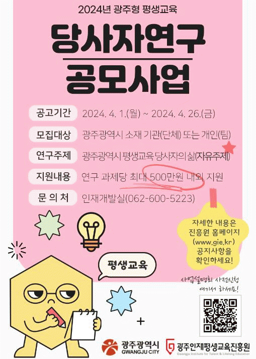 [¹Ìµð¾îÀü³² Á¦°¥´ëÁ¾ ±âÀÚ]±¤ÁÖ±¤¿ª½Ã¿Í (Àç)±¤ÁÖÀÎÀçÆò»ý±³À°ÁøÈï¿øÀÌ ¿À´Â 26ÀϱîÁö Áö¿ª ³» ±â°ü°ú °³ÀÎÀ» ´ë»óÀ¸·Î '2024³â ±¤ÁÖÇü Æò»ý±³À° ´ç»çÀÚ¿¬±¸' »ç¾÷À» °ø¸ðÇÑ´Ù. ±¤ÁÖÇü Æò»ý±³À° ´ç»çÀÚ¿¬±¸´Â ±¤ÁÖÁö¿ª¿¡ °ÅÁÖÇÏ´Â Æò»ý¡¦