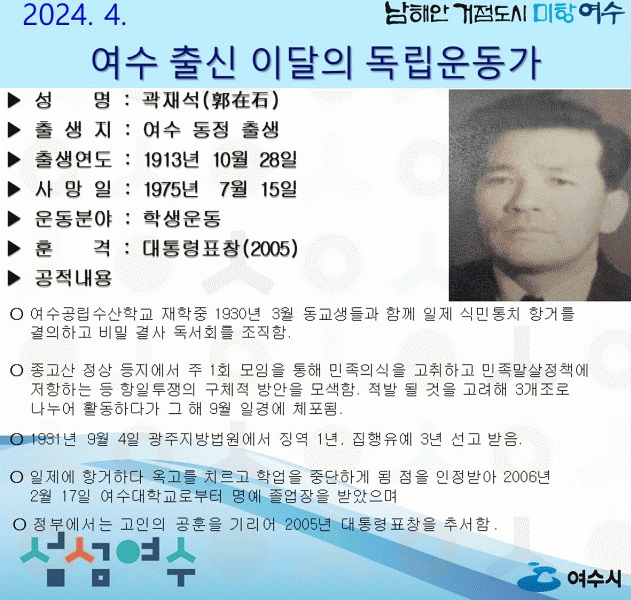 [¹Ìµð¾îÀü³² ÀüÇü¼º ±âÀÚ]¿©¼ö½Ã(½ÃÀå Á¤±â¸í)°¡ 4¿ùÀÇ µ¶¸³¿îµ¿°¡·Î ¿©¼ö µ¿Á¤ Å»ý ¡®°ûÀç¼®(άî¤à´)¼±»ý¡¯À» ¼±Á¤Çß´Ù. ¡®°ûÀç¼® ¼±»ý¡¯Àº ¿©¼ö°ø¸³¼ö»êÇб³ ÀçÇÐ ÁßÀÌ´ø 1930³â 3¿ù µ¿±³»ýµé°ú ÇÔ²² ÀÏÁ¦ ½Ä¹ÎÅëÄ¡ ÇװŸ¦ °áÀÇÇÏ°í¡¦