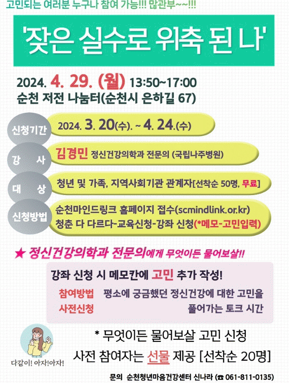 [¹Ìµð¾îÀü³² ÀÓ¼º¿Ï ±âÀÚ]¼øÃµ½Ã´Â ¿À´Â 29ÀÏ ¿ÀÈÄ 2½Ã ¼øÃµ ÀúÀü ³ª´®ÅÍ¿¡¼ û³â ¹× °¡Á·, Áö¿ª»çȸ±â°üÀ» ´ë»óÀ¸·Î Á¤½Å°Ç° ÁõÁøÀ» À§ÇÑ °ø°³°Á¸¦ ¿¬´Ù°í ¹àÇû´Ù. À̹ø °Á´ ±¹¸³³ªÁÖº´¿ø ±è°æ¹Î Á¤½Å°Ç°ÀÇÇаú Àü¹®ÀǸ¦ ÃʺùÇØ¡¦