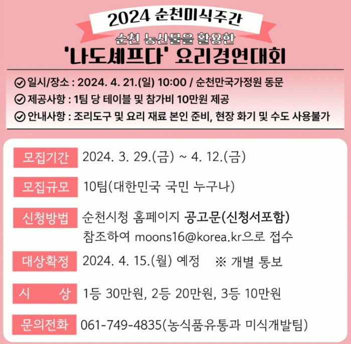 [¹Ìµð¾îÀü³² ÀÓ¼º¿Ï ±âÀÚ]¼øÃµ½Ã´Â ¿À´Â 12ÀϱîÁö ¡®³ªµµ ¼ÎÇÁ´Ù! À½½Ä°æ¿¬´ëȸ¡¯ Âü°¡ÀÚ¸¦ ¸ðÁýÇÑ´Ù°í ¹àÇû´Ù. À̹ø ´ëȸ´Â '2024 ¼øÃµ¹Ì½ÄÁÖ°£' ÇÁ·Î±×·¥ Áß ÇϳªÀÌ¸ç ¡®Áö¿ª³ó»ê¹°À» Ȱ¿ëÇÑ ¹«Ä§¿ä¸® ¸¸µé±â¡¯¸¦ ÁÖÁ¦·Î ¼øÃµÀÇ Ã»Á¤¡¦