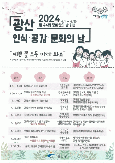 [¹Ìµð¾îÀü³² ±èÁ¤¿ì ±âÀÚ]±¤ÁÖ ±¤»ê±¸°¡ 4¿ù 20ÀÏ Á¦44ȸ Àå¾ÖÀÎÀÇ ³¯À» ¸Â¾Æ 4¿ù ÇÑ ´Þ°£ Àå¾Ö Àνݳ¼±, Àå¾ÖÀΰú ºñÀå¾ÖÀÎÀÇ ±³·ù¿Í °ø°¨ È®»êÀ» À§ÇØ ´Ùä·Î¿î Çà»ç¸¦ ÁøÇàÇÑ´Ù. ±¤»ê±¸´Â ¿ÃÇØ Àå¾ÖÀÎÀÇ ³¯ ÁÖ°£ Àνݳ¼± ¿îµ¿Ç¥¾î·Î¡¦