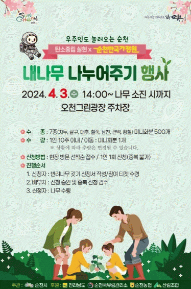 [¹Ìµð¾îÀü³² ÀÓ¼º¿Ï ±âÀÚ]¼øÃµ½Ã´Â ¼øÃµ¸¸±¹°¡Á¤¿ø °³ÀåÀ» ¸ÂÀÌÇÏ¿© '³»³ª¹« ³ª´©¾îÁÖ±â Çà»ç'¸¦ ¿À´Â 3ÀÏ ¿Àõ±×¸°±¤Àå ÁÖÂ÷Àå¿¡¼ °³ÃÖÇÑ´Ù°í ¹àÇû´Ù. À̹ø Çà»ç´Â ¡®¿ìÁÖÀεµ ³î·¯¿À´Â ¼øÃµ¡¯À» ÁÖÁ¦·Î ÇÑ ¼øÃµ¸¸±¹°¡Á¤¿øÀÇ °³¸·À» ±â¡¦