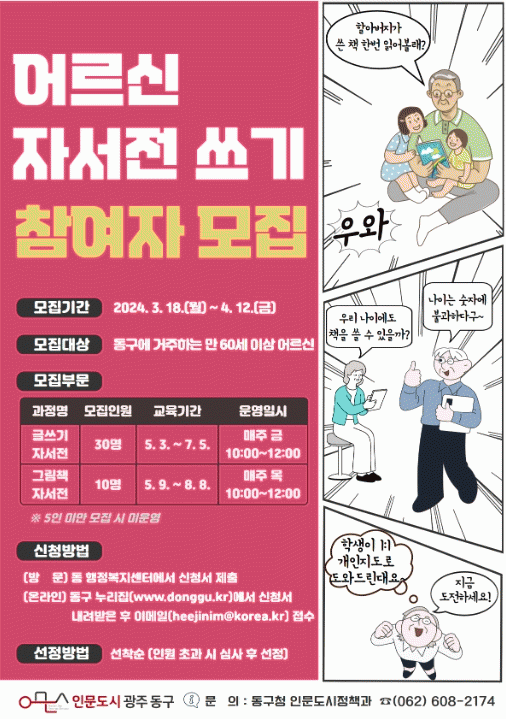 [¹Ìµð¾îÀü³² ±èÁ¤¿ì ±âÀÚ]±¤ÁÖ±¤¿ª½Ã µ¿±¸´Â ¾î¸£½ÅµéÀÇ ºû³ª´Â ûÃá°ú ¼þ°íÇÑ »îÀ» ÀçÁ¶¸íÇØ ±Û¾²±â¿Í ±×¸²Ã¥À¸·Î ÃâÆÇÇÏ´Â ¡®¾î¸£½Å ÀÚ¼Àü ¾²±â¡¯ Âü¿©ÀÚ¸¦ ¿À´Â 4¿ù 12ÀϱîÁö ¸ðÁýÇÑ´Ù°í ¹àÇû´Ù. ¡®»ý¾ÖÃâÆÇ »ç¾÷¡¯Àº ¾î¸£½ÅµéÀÇ ±â¡¦