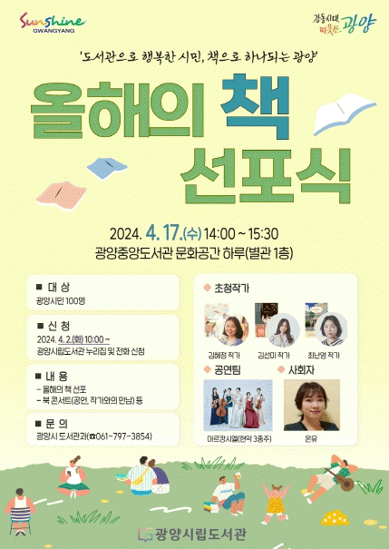 [¹Ìµð¾îÀü³² ÀÓ¼º¿Ï ±âÀÚ]±¤¾ç½Ã°¡ ¿À´Â 17ÀÏ ¿ÀÈÄ 2½Ã ±¤¾çÁß¾Óµµ¼°ü ¹®È°ø°£ ÇÏ·ç¿¡¼ ¡®2024 ±¤¾ç½Ã ¿ÃÇØÀÇ Ã¥ ¼±Æ÷½Ä¡¯À» ½ÃÀÛÀ¸·Î ¡®½Ã¹Î ÇÑ Ã¥ Àб⡯¸¦ º»°Ý ÃßÁøÇÑ´Ù. 2010³â ½ÃÀÛÇØ ¿ÃÇØ·Î 15ȸ°¸¦ ¸Â´Â ¡®±¤¾ç½Ã ¿ÃÇØÀÇ Ã¥¡¦
