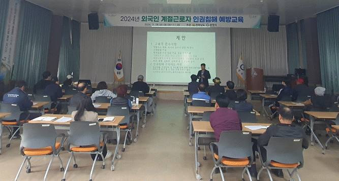 [¹Ìµð¾îÀü³² ÀÓ¼º¿Ï ±âÀÚ]±¤¾ç½Ã´Â 29ÀÏ ³ó¾÷±â¼ú¼¾ÅÍ ³ó¾÷Àα³À°°ü¿¡¼ ¿Ü±¹ÀÎ °èÀý±Ù·ÎÀÚ °í¿ëÁÖ 20¿© ¸íÀ» ´ë»óÀ¸·Î ÀαÇÄ§ÇØ ¿¹¹æ±³À°À» ½Ç½ÃÇß´Ù. À̳¯ ±³À°Àº ÃÖ±Ù ¿Ü±¹ÀÎ °èÀý±Ù·ÎÀÚ À뱂 ¹®Á¦°¡ »çȸÀû À̽´·Î ´ëµÎµÊ¿¡ µû¶ó °í¡¦