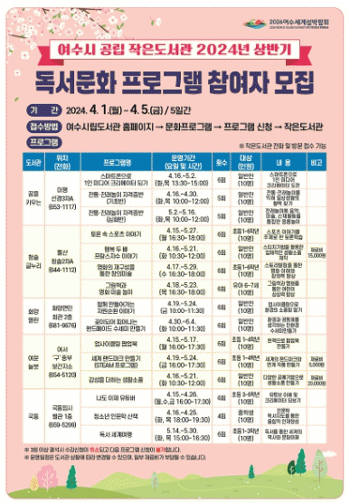 [¹Ìµð¾îÀü³² ÀüÇü¼º ±âÀÚ]¿©¼ö½Ã °ø¸³ ÀÛÀºµµ¼°ü 5°³¼Ò¿¡¼ ¡®2024³â »ó¹Ý±â µ¶¼¹®È ÇÁ·Î±×·¥¡¯ Âü¿©ÀÚ¸¦ ¸ðÁýÇÑ´Ù. ÇÁ·Î±×·¥Àº ÃʵîÇлýºÎÅÍ ¼ºÀαîÁö Àü ½Ã¹ÎÀ» ´ë»óÀ¸·Î 4¿ù Áß¼øºÎÅÍ 6¿ù ÃʱîÁö ²ÞÀ»Å°¿ì´Â, û¼Ö±Û´©¸®, Ⱦ翸°¡¦