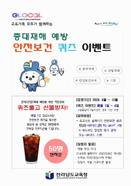 [¹Ìµð¾îÀü³² °í±Ô¼® ±âÀÚ]Àü¶ó³²µµ±³À°Ã»ÀÌ ±¸¼º¿øµéÀÇ ¾ÈÀüº¸°Ç Áö½ÄÀ» ³ôÀÏ ¼ö ÀÖ´Â ¡®Áß´ëÀçÇØ ¿¹¹æ ¾ÈÀüº¸°Ç ÄûÁî À̺¥Æ®¡¯¸¦ ÁøÇàÇÑ´Ù. À̺¥Æ®´Â 4¿ùºÎÅÍ 12¿ù±îÁö ¿î¿µÇϸç, ¸Å¿ù 1 ºÎÅÍ 4ÀÏ »çÀÌ ÀÀ¸ðÇÒ ¼ö ÀÖ´Ù. ÄûÁî ³»¿ëÀº Áß¡¦