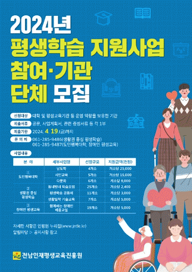 [¹Ìµð¾îÀü³² Á¦°¥´ëÁ¾ ±âÀÚ]Àü¶ó³²µµ¿Í Àü³²ÀÎÀçÆò»ý±³À°ÁøÈï¿øÀÌ Àü³² Æò»ý±³À° Ȱ¼ºÈ¸¦ À§ÇØ »ç¾÷À» ¿î¿µÇÒ Æò»ý±³À° °ü·Ã ±â°ü¡¤´Üü¸¦ °ø°³ ¸ðÁýÇÑ´Ù. Àü³² Æò»ý±³À° Ȱ¼ºÈ Áö¿ø»ç¾÷Àº µµ¹ÎÀÇ ´Ù¾çÇÑ ±³À° ¿å±¸ ÃæÁ·°ú Áö¿ªÀÇ Æò»ý¡¦
