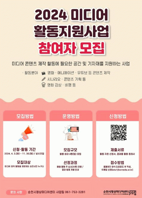 [¹Ìµð¾îÀü³² ÀÓ¼º¿Ï ±âÀÚ]¼øÃµ½Ã¿µ»ó¹Ìµð¾î¼¾ÅÍ´Â '2024 ¹Ìµð¾îȰµ¿ Áö¿ø»ç¾÷'À» ¿î¿µÇÑ´Ù°í ¹àÇû´Ù. À̹ø »ç¾÷Àº ¹Ìµð¾î Ä¿¹Â´ÏƼ Ȱµ¿°ú ÄÜÅÙÃ÷ Á¦ÀÛ¿¡ ÇÊ¿äÇÑ ¹Ìµð¾î ½Ã¼³°ú ±âÀÚÀ縦 Áö¿øÇÏ´Â »ç¾÷À¸·Î ¹Ìµð¾îȰµ¿¿¡ ´ëÇÑ ¼øÃµ½Ã¹Î¡¦