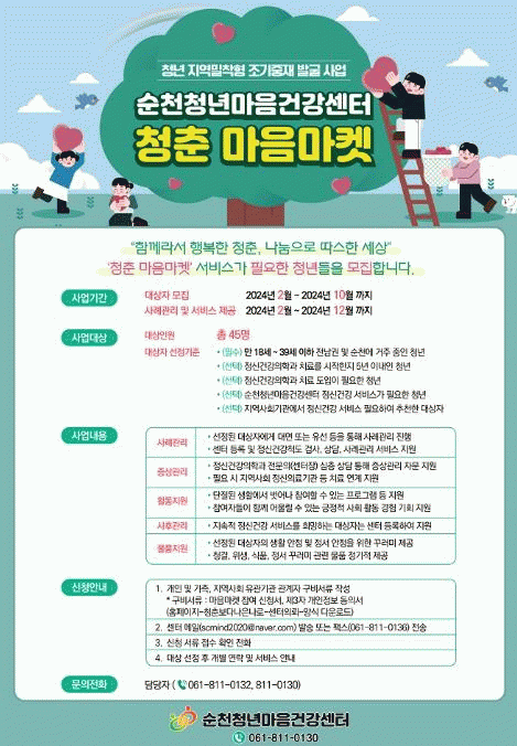 [¹Ìµð¾îÀü³² ÀÓ¼º¿Ï ±âÀÚ]¼øÃµÃ»³â¸¶À½°Ç°¼¾ÅÍ(¸¶Àε帵ũ)´Â Áö¿ª ¹ÐÂøÇü Á¶±âÁßÀç¹ß±¼»ç¾÷ ÀÏȯÀ¸·Î ¡®Ã»Ãá ¸¶À½¸¶ÄÏ¡¯ Âü¿©ÀÚ¸¦ ¿À´Â 11¿ù±îÁö ¼±Âø¼ø 45¸íÀ» ¸ðÁýÇÑ´Ù. ¡®Ã»Ãá ¸¶À½¸¶ÄÏ¡¯Àº Áö¿ª»çȸ Á¤½Å°Ç° °ü½É±º û³âµéÀÇ ¸¶À½¡¦