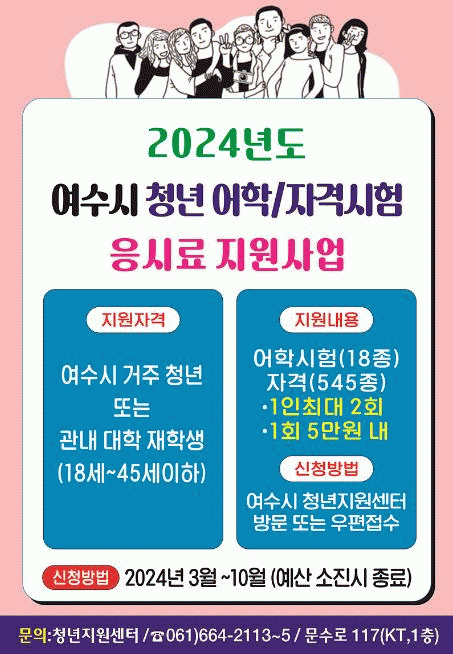 [¹Ìµð¾îÀü³² ÀüÇü¼º ±âÀÚ]¿©¼ö½Ã°¡ û³âµéÀÇ Ãë¾÷ °æÀï·ÂÀ» °ÈÇÏ°í °æÁ¦Àû ºÎ´ã ¿Ïȸ¦ À§ÇØÃ»³âµé¿¡°Ô ¾îÇС¤ÀڰݽÃÇè ÀÀ½Ã·á¸¦ Áö¿øÇÑ´Ù. Áö¿ø ´ë»óÀº 18¼¼¿¡¼ 45¼¼ û³âÀ¸·Î, ¿©¼ö½Ã¿¡ Áֹεî·ÏÀ» µÎ°Å³ª °ü³» ¼ÒÀç ´ëÇб³¿¡ À硦
