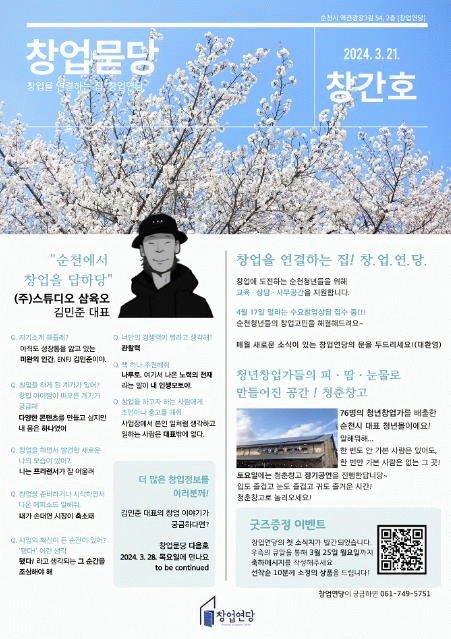 [¹Ìµð¾îÀü³² ÀÓ¼º¿Ï ±âÀÚ]¼øÃµ½Ã´Â â¾÷¿¬´çÀÇ ÃֽŠ¼Ò½Ä°ú ¼±¹èâ¾÷ÀÚÀÇ »ý»ýÇÑ À̾߱⸦ µé·ÁÁÖ´Â ¼Ò½ÄÁö¡®Ã¢¾÷¹¯´ç¡¯À» ¹ß°£ÇÑ´Ù°í ¹àÇû´Ù. ¡®Ã¢¾÷¹¯´ç¡¯Àº ¸Å¿ù µÑ°¡¤³Ý°ÁÖ ¸ñ¿äÀÏ¿¡ ¹ßÇàµÇ¸ç, â¾÷¿¬´çÀÇ »õ¼Ò½Ä, â¾÷Áö¿ø»ç¾÷ ¾È¡¦