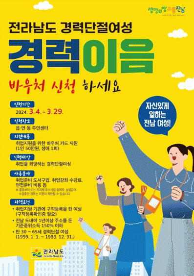 [¹Ìµð¾îÀü³² Á¦°¥´ëÁ¾ ±âÀÚ]Àü¶ó³²µµ´Â Ãâ»ê°ú À°¾Æ µîÀ¸·Î Á÷ÀåÀ» ±×¸¸µÐ ÈÄ ÀçÃë¾÷¿¡ ¾î·Á¿òÀ» °Þ´Â °æ·Â ´ÜÀý ¿©¼º¿¡°Ô ±¸Á÷¿¡ ÇÊ¿äÇÑ Ãë¾÷¡¤¸éÁ¢ Áغñ ºñ¿ëÀ» Áö¿øÇÏ´Â ¡®°æ·ÂÀÌÀ½¹Ù¿ìó¡¯ ÀÌ¿ëÀÚ¸¦ ¿À´Â 29ÀϱîÁö ¸ðÁýÇÑ´Ù°í ¹àÇû´Ù¡¦