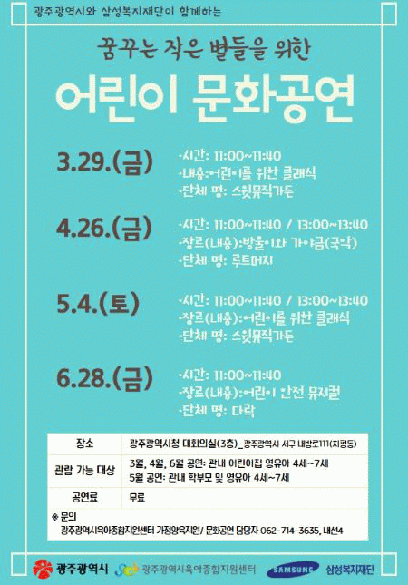 [¹Ìµð¾îÀü³² Á¦°¥´ëÁ¾ ±âÀÚ]±¤ÁÖ½Ãû ´ëȸÀǽÇÀÌ ¸Å¿ù ¸¶Áö¸· ÁÖ ±Ý¿äÀÏ ¾î¸°ÀÌ ¹®È°ø¿¬ÀåÀ¸·Î º¯½ÅÇÑ´Ù. ±¤ÁÖ±¤¿ª½Ã´Â 3¿ùºÎÅÍ 6¿ù±îÁö ½Ãû ´ëȸÀǽǿ¡¼ ¡®²Þ²Ù´Â ÀÛÀº º°µéÀ» À§ÇÑ ¾î¸°ÀÌ ¹®È°ø¿¬¡¯À» ¼±º¸ÀδÙ. ÀÌ ÇÁ·Î±×·¥Àº »ï¡¦