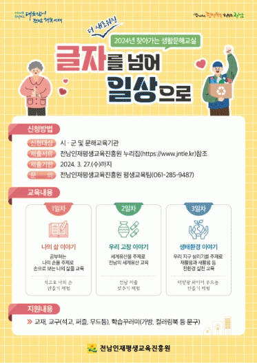 [¹Ìµð¾îÀü³² Á¦°¥´ëÁ¾ ±âÀÚ]Àü¶ó³²µµ¿Í Àü³²ÀÎÀçÆò»ý±³À°ÁøÈï¿øÀº ±³À° ±âȸ¸¦ ³õÄ£ µµ¹ÎÀ» ´ë»óÀ¸·Î ±ÛÀÚ ÇØµæÀ» ³Ñ¾î ÀÏ»ó»ýȰ¿¡ ÇÊ¿äÇÑ ±âÃÊ»ýȰ´É·Â Çâ»óÀ» À§ÇÑ Ã£¾Æ°¡´Â »ýȰ¹®Çر³½ÇÀ» ¿î¿µÇÒ ±â°üÀ» ¸ðÁýÇÑ´Ù°í ¹àÇû´Ù. ã¾Æ°¡´Â¡¦