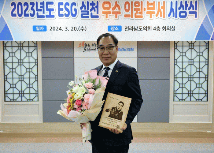 [¹Ìµð¾îÀü³² Á¦°¥´ëÁ¾ ±âÀÚ]Àü¶ó³²µµÀÇȸ ±èȸ½Ä ÀÇ¿ø(´õºÒ¾î¹ÎÁÖ´ç, À强2)ÀÌ 3¿ù 20ÀÏ 2023³âµµ ¡®ESG ÃßÁø ¿ì¼öÀÇ¿ø¡¯À¸·Î ¼±Á¤µÇ´Â ¿µ¿¹¸¦ ¾È¾Ò´Ù. ¡®ESG ÃßÁø ¿ì¼öÀÇ¿ø¡¯Àº Àü¶ó³²µµÀÇȸ°¡ ÀÇÁ¤¿¡ °É¸ÂÀº ESG ½Ã½ºÅÛ ±â¹ÝÀ» ¸¶·ÃÇÏ¡¦