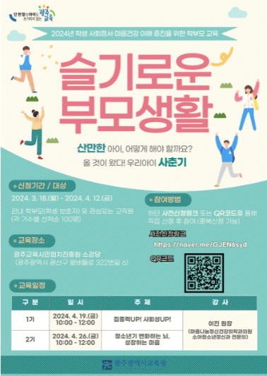[¹Ìµð¾îÀü³² Á¦°¥´ëÁ¾ ±âÀÚ]±¤Áֽñ³À°Ã»ÀÌ ¿À´Â 4¿ù 19Àϰú 4¿ù 26ÀÏ 2Â÷·Ê ±¤ÁÖ±³À°½Ã¹ÎÇùÄ¡ÁøÈï¿ø ¼Ò°´ç¿¡¼ Çкθð(º¸È£ÀÚ) ´ë»ó Çлý »çȸÁ¤¼¡¤¸¶À½°Ç° ÀÌÇØ ÁõÁøÀ» À§ÇÑ Çкθ𠱳À° ¡®½½±â·Î¿î ºÎ¸ð »ýȰ¡¯À» ½Ç½ÃÇÑ´Ù. 18ÀÏ¡¦