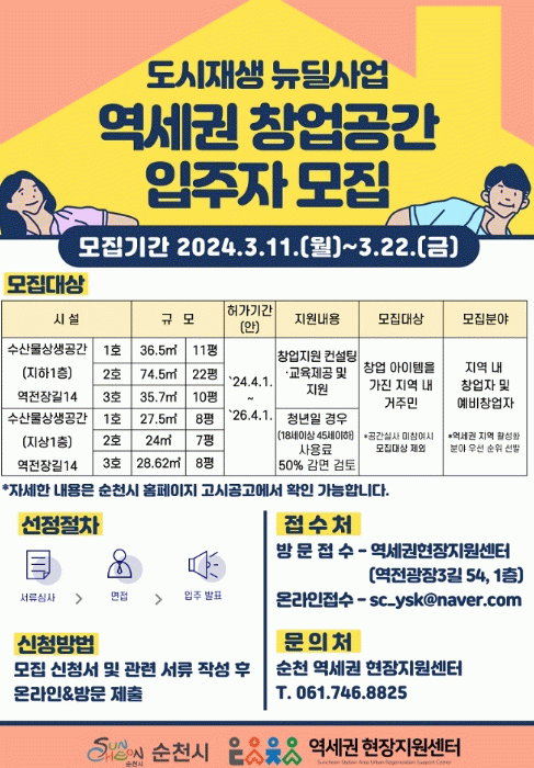 [¹Ìµð¾îÀü³² ÀÓ¼º¿Ï ±âÀÚ]¼øÃµ½Ã´Â Áö¿ª ³» â¾÷ÀÚ ¹× ¿¹ºñâ¾÷ÀÚ¸¦ ´ë»óÀ¸·Î ¿ª¼¼±Ç â¾÷ °ø°£ÀΡ®¼ö»ê¹°»ó»ý°ø°£¡¯ÀÇ ÀÔÁÖÀÚ¸¦ ¿À´Â 22ÀϱîÁö ¸ðÁýÇÑ´Ù°í ¹àÇû´Ù. ¡®¼ö»ê¹°»ó»ý°ø°£¡¯Àº ¿ªÀü½ÃÀå ³» Á¡Æ÷¸¦ ¸®¸ðµ¨¸µÇÏ¿© ¿ª¼¼±Ç µµ½ÃÀ硦