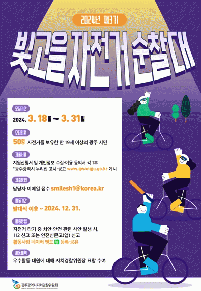 [¹Ìµð¾îÀü³² Á¦°¥´ëÁ¾ ±âÀÚ]±¤ÁÖ±¤¿ª½ÃÀÚÄ¡°æÂûÀ§¿øÈ¸´Â Áö¿ª ¾ÈÀüÁöÅ´ÀÌ ¡®Á¦3±â ºû°íÀ»ÀÚÀü°Å¼øÂû´ë¡¯¸¦ ¸ðÁýÇÑ´Ù. ºû°íÀ»ÀÚÀü°Å¼øÂû´ë´Â Áö¿ªÄ¡¾È ¹®Á¦¿¡ ½Ã¹ÎÀÌ ÀÚ¹ßÀûÀ¸·Î Âü¿©Çϵµ·Ï À¯µµÇϱâ À§ÇØ 2022³â ¹ßÁ·Çß´Ù. ½Ã¹ÎÀ¸·Î ±¸¼º¡¦