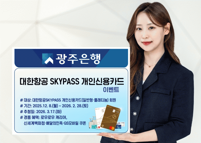 [¹Ìµð¾îÀü³² Á¦°¥´ëÁ¾ ±âÀÚ]±¤ÁÖÀºÇàÀº 2025³â 12¿ù 8ÀϺÎÅÍ 2026³â 2¿ù 28ÀϱîÁö ¡®ÇϴñæÀ» ä¿ì´Â ´ëÇÑÇ×°øSKYPASS°³ÀνſëÄ«µå À̺¥Æ®¡¯¸¦ ÁøÇàÇÑ´Ù°í ¹àÇû´Ù. À̹ø À̺¥Æ®´Â ¡®´ëÇÑÇ×°øSKYPASS °³ÀνſëÄ«µå(ÀϹÝÇü/Ç÷¡Æ¼´½Çü)¡¦